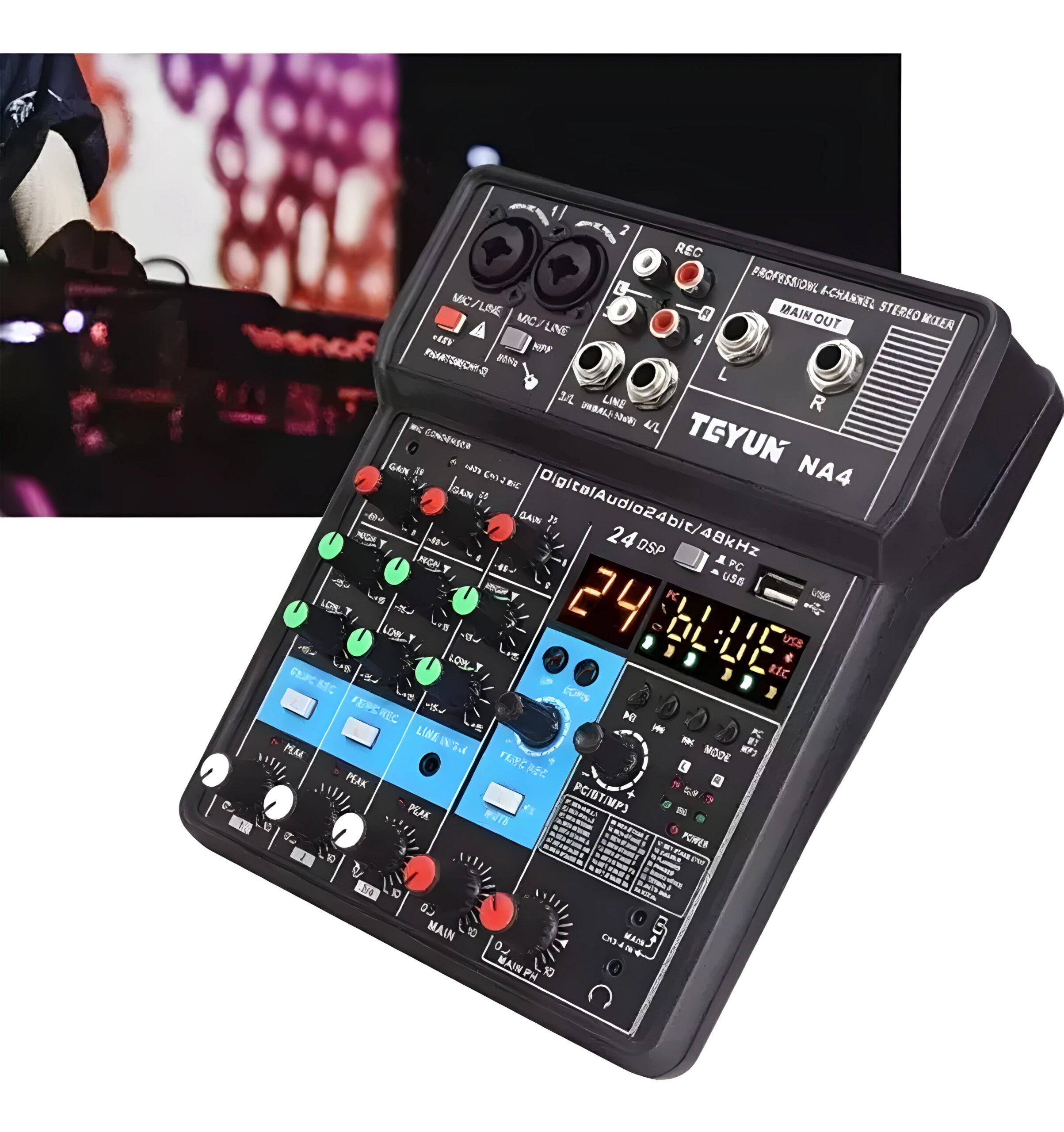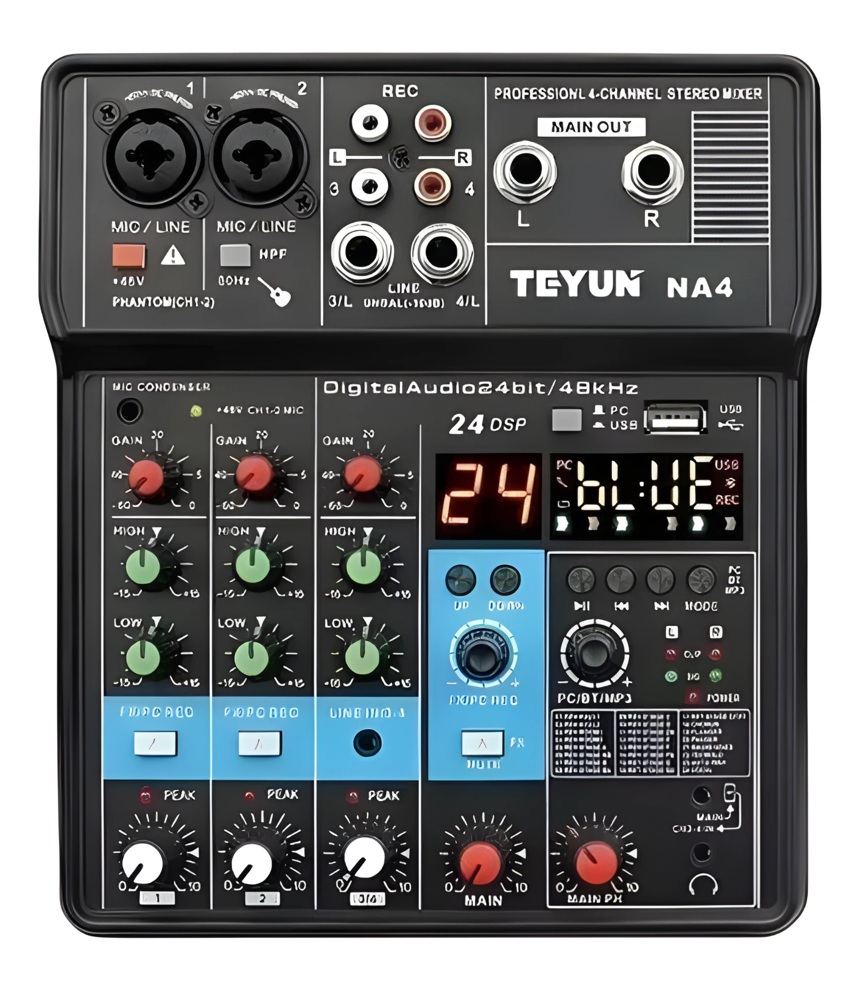 A Mesa de Som TEYUN NA4 é uma mesa de mixagem analógica compacta e versátil, ideal para eventos ao vivo, podcasts, palestras e apresentações musicais intimistas. Com 4 canais de entrada, oferece conectividade abrangente, incluindo portas P10, RCA, USB e XLR, além de suporte para Bluetooth, facilitando a integração com diversos dispositivos de áudio.